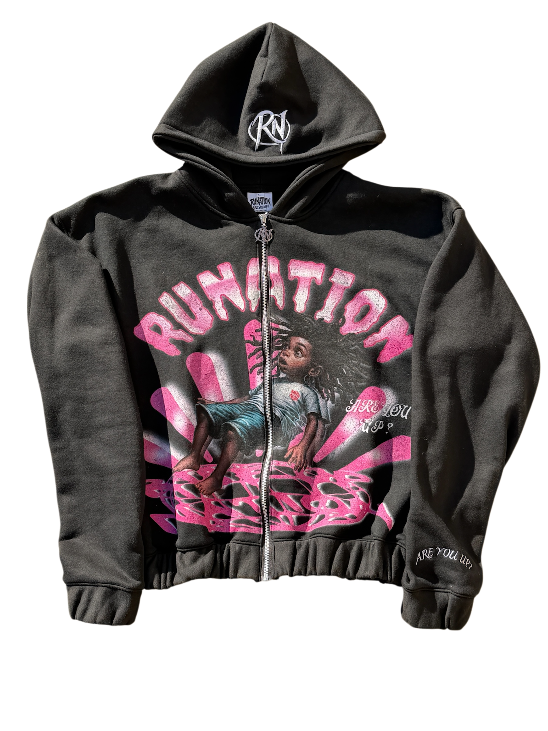 Custom embroidery details include an RN monogram on the hood and “ARE YOU UP?” stitched on the sleeve, adding premium texture and depth. The hoodie includes a centered zipper, gathered elastic waistband, and ribbed cuffs for a structured yet relaxed fit.
