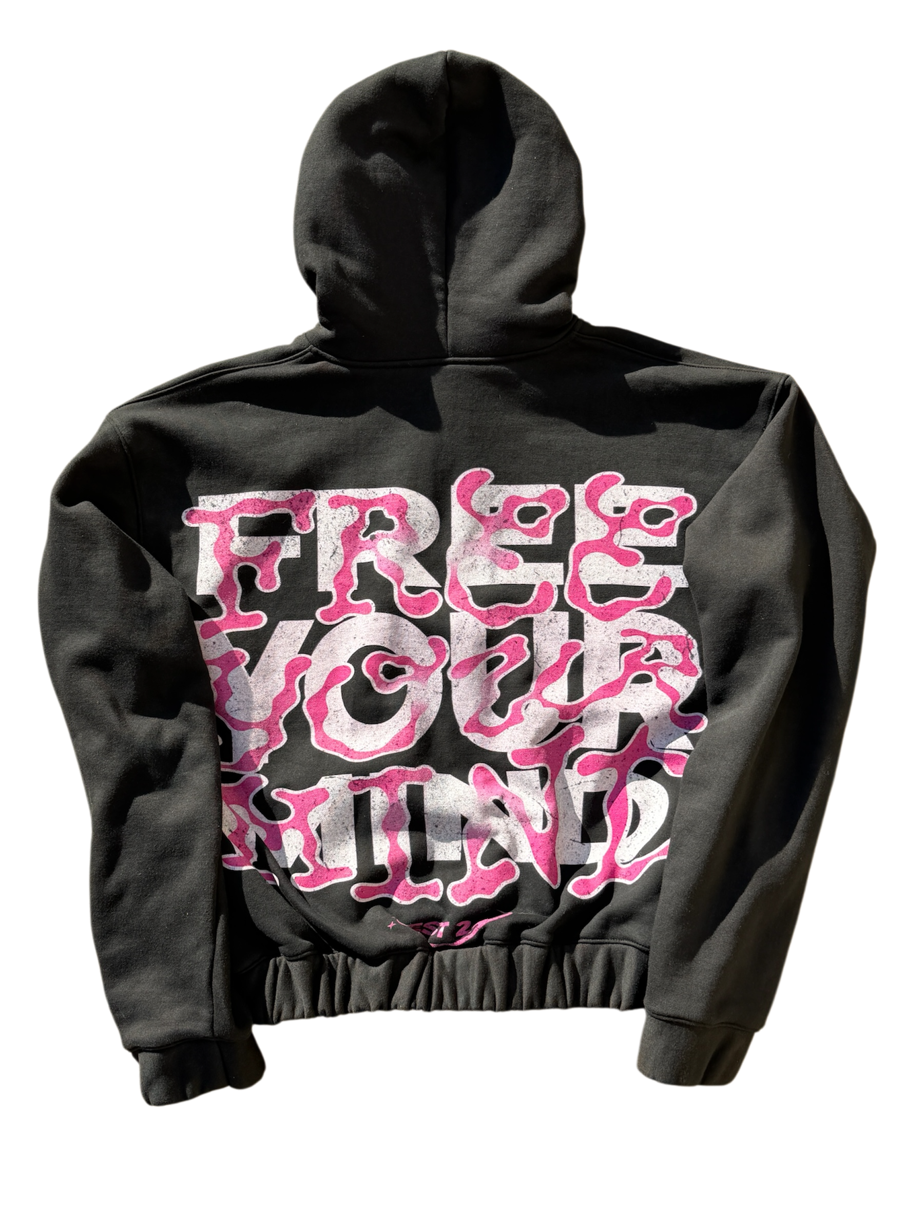 Back: “FREE YOUR MIND” large graphic print in white & pink